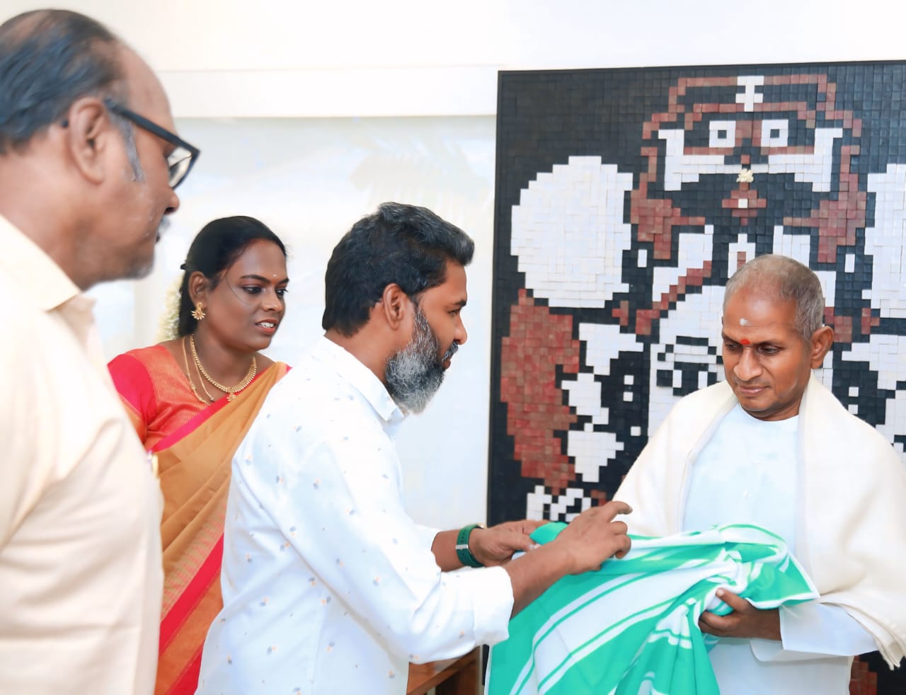 To mark this occasion, a special archanai (ritual) was conducted in his name at the Vadapalani Murugan Temple. The association members then presented Ilaiyaraaja with the temple prasadam and a beautifully crafted memento.